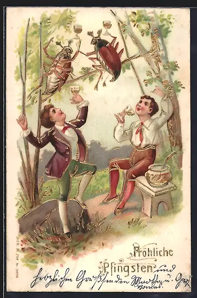 AK Maikäfer stossen mit zwei Männern an, Pfingstgrüsse