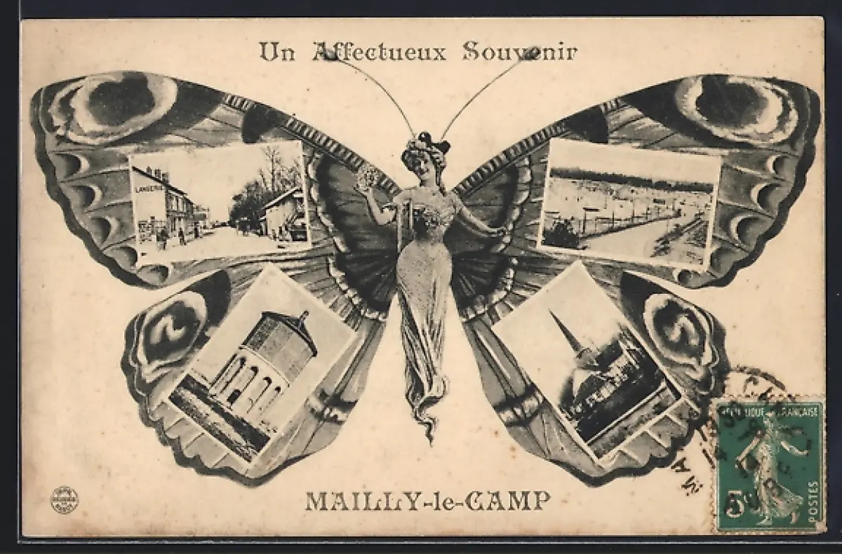 AK Mailly-le-Camp, Fliegende Menschen, Ansichten von Wasserturm und Kirche auf Schmetterlingsflügeln