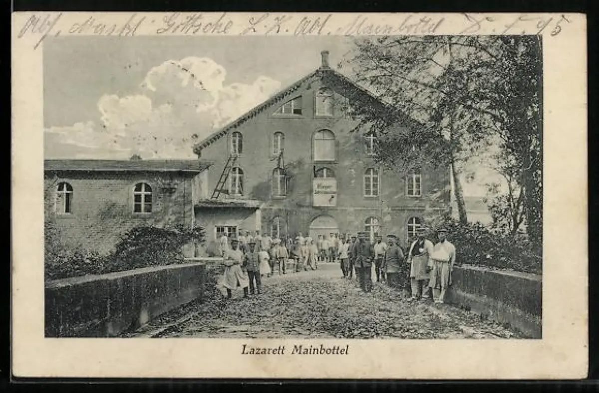 AK Mainbottel, Vue du lazaret avec des soldats et visiteurs devant le bâtiment