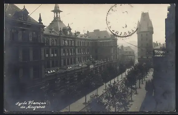 AK Mainz, Französisches Lyceum mit Uferstrasse aus der Vogelschau, Turm