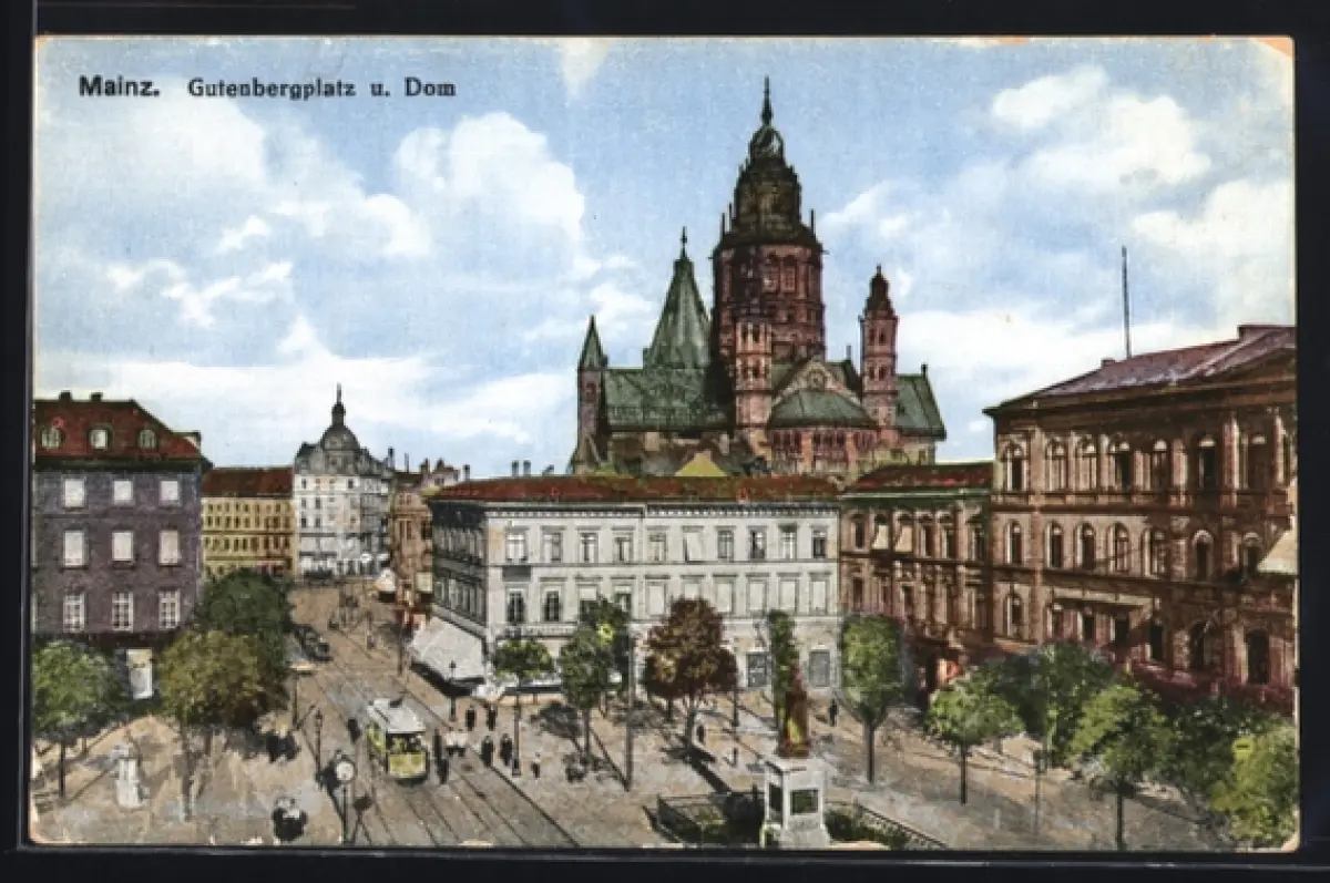 AK Mainz, Gutenbergplatz u. Dom, Strassenbahn