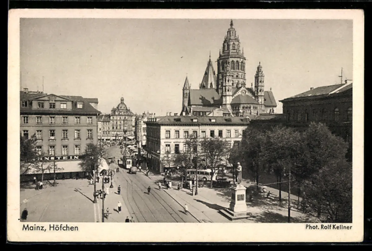 AK Mainz, Höfchen, Dom, Strassenbahn, Denkmal