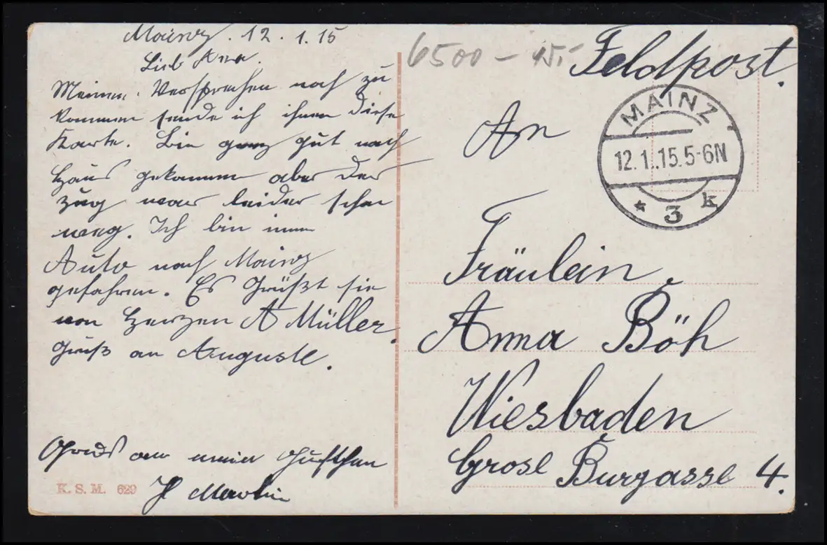 AK Mainz: Kaiserstraße mit Christuskirche, Feldpost MIANZ 3 k 12.1.1915