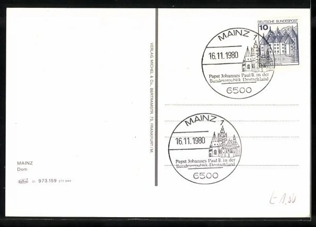 AK Mainz, Papstbesuch Papst Johannes Paul II. 1980, Dom und Geschäft