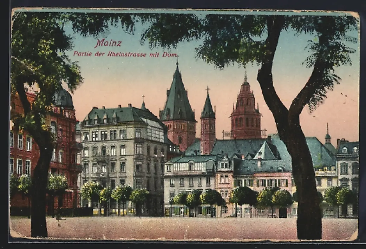 AK Mainz, Partie der Rheinstrasse mit Dom