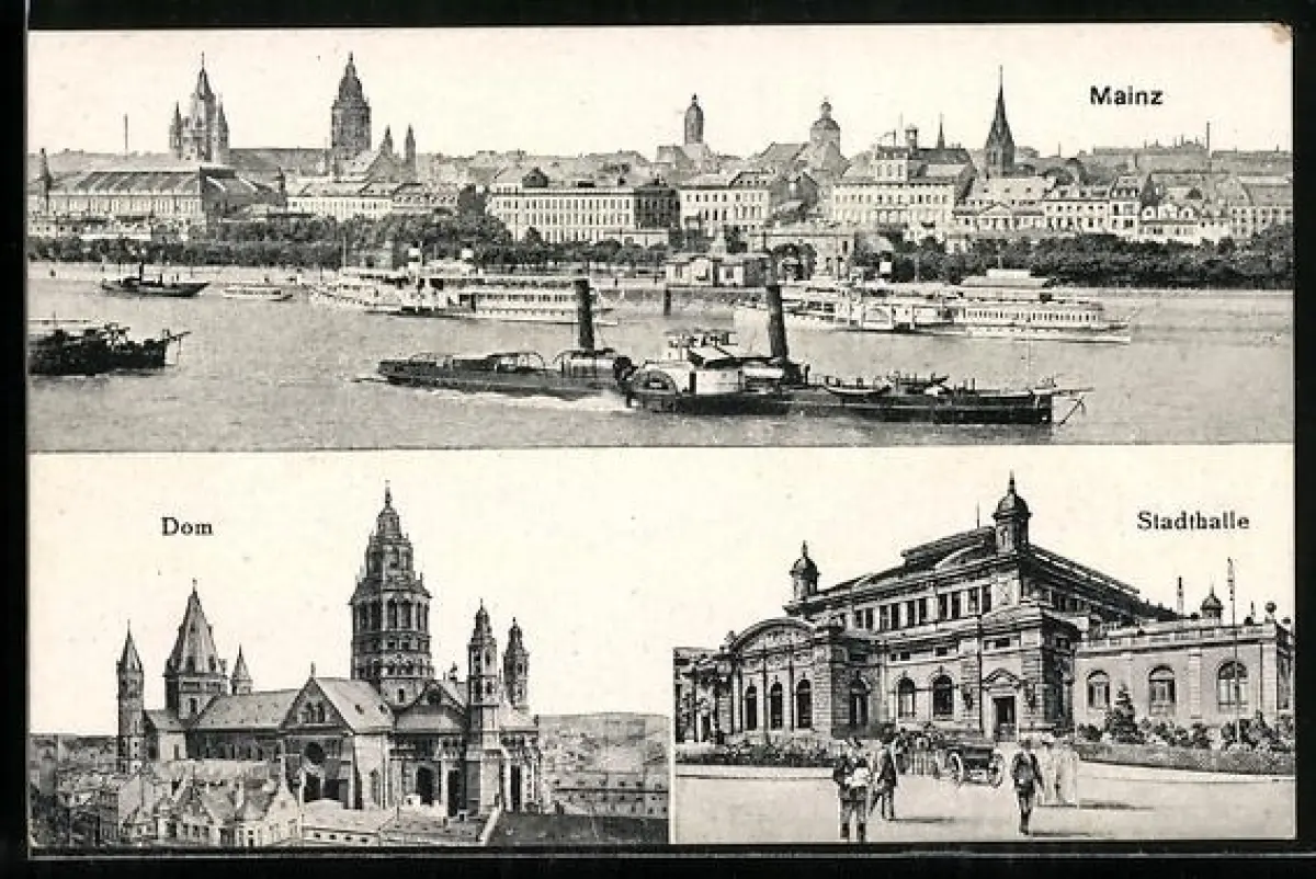 AK Mainz, Rheinpanorama, Dom, Stadthalle