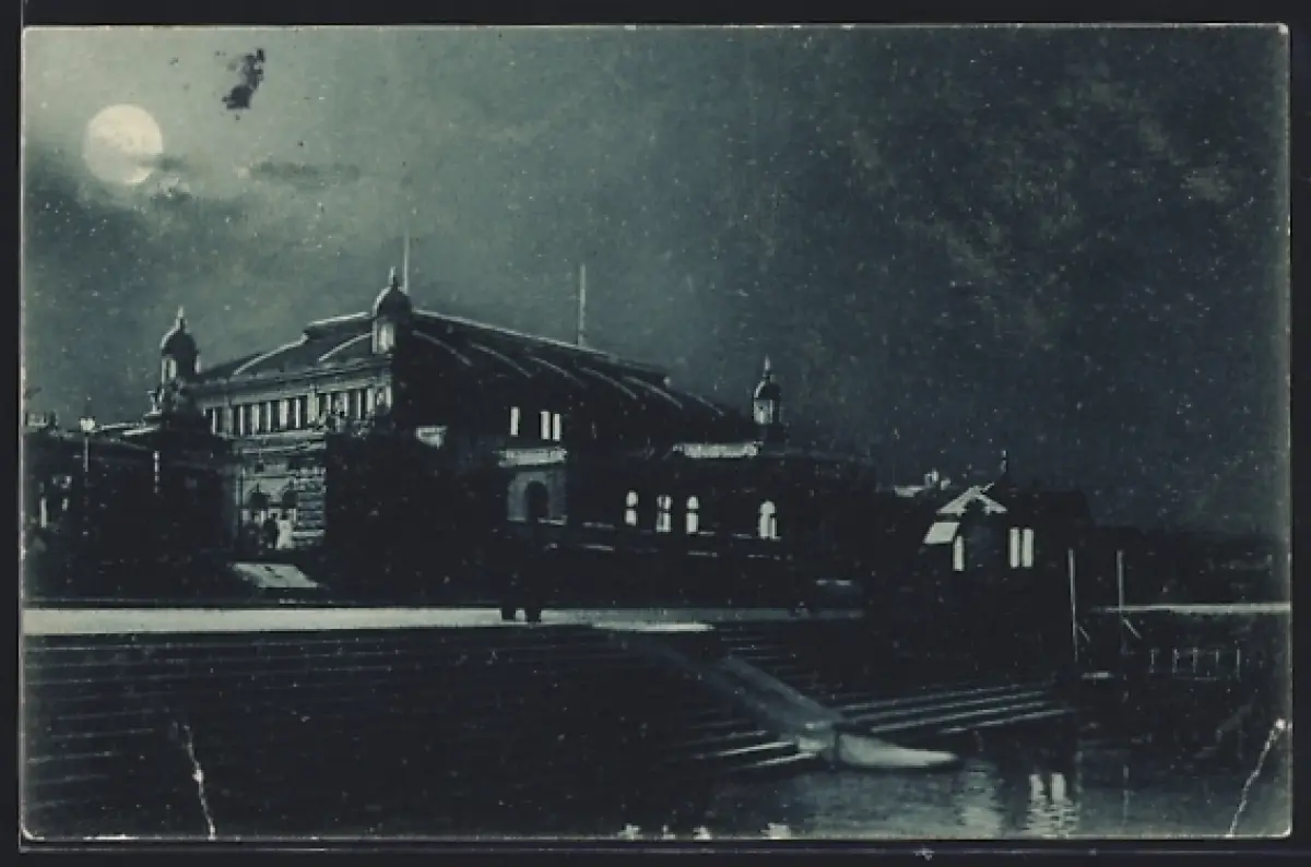 AK Mainz, Stadthalle mit neuer Rheinterrasse bei Nacht