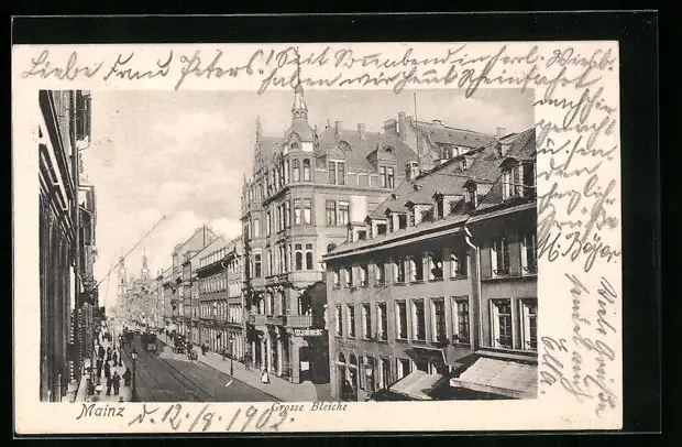 AK Mainz, Strasse Grosse Bleiche mit Geschäften und Strassenbahn