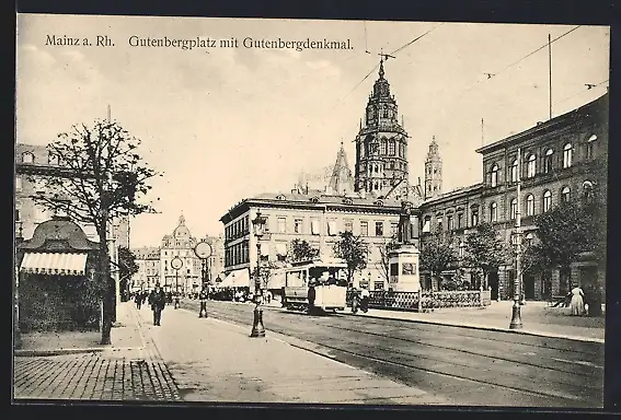 AK Mainz a. Rh., Strassenbahn auf dem Gutenbergplatz, Gutenbergdenkmal