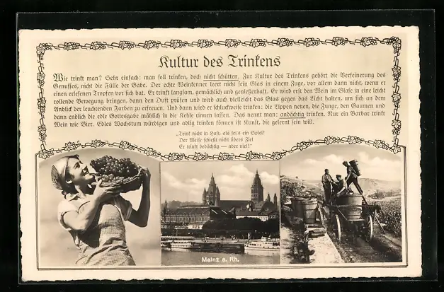 AK Mainz a. Rh., Uferpartie mit Kirche, Frau mit Weintrauben, Bauern mit Karren