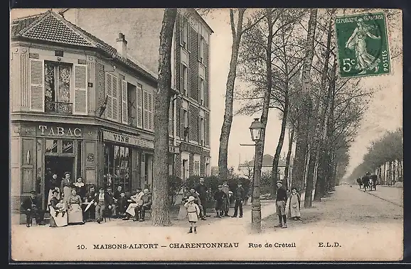 AK Maisons-Alfort, Rue de Créteil avec groupe devant un tabac et arbres alignés