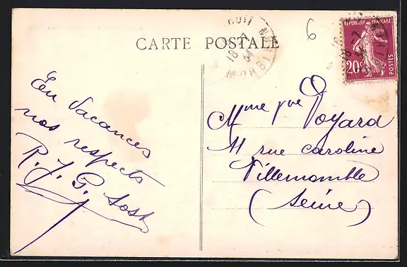 Personenbezogene Daten auf der Rückseite der Karte wurden durch blauen Textmarker unkenntlich gemacht. Die blauen Stellen sind auf die Vorderseite durchgeweicht und wirken sich negativ auf das Postkartenfoto aus