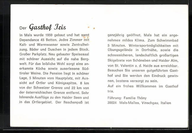 AK Mals, Pension-Restaurant Iris Albergo in zwei Ansichten mit Ortsansicht
