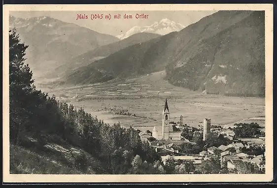 AK Mals, Teilansicht mit Kirche und dem Ortler