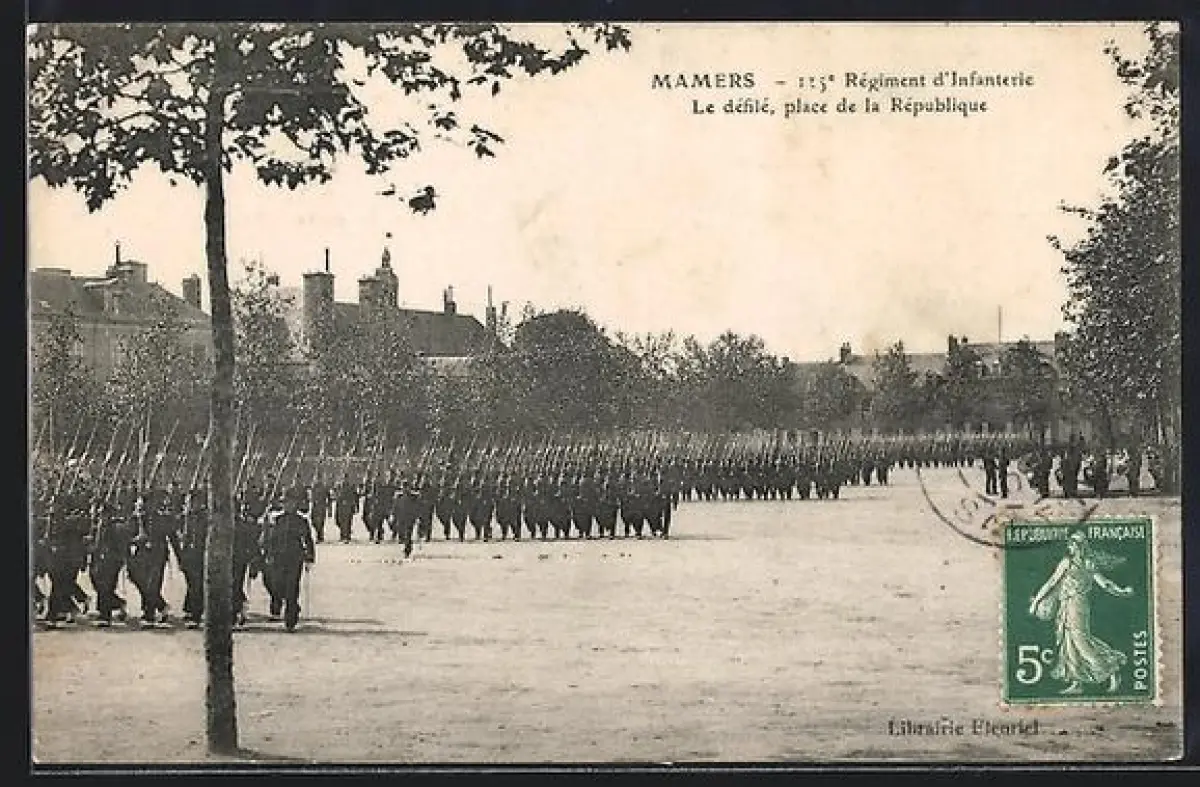AK Mamers, 115e Régiment d`Infanterie défilé, place de la République