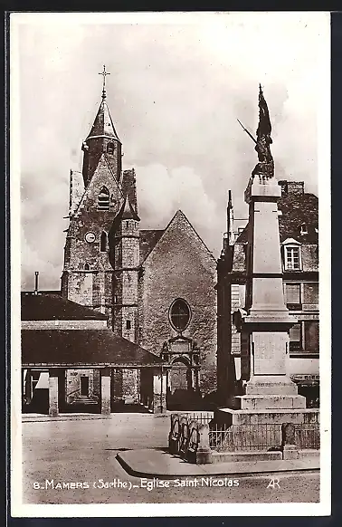 AK Mamers, Église Saint-Nicolas et monument en ville