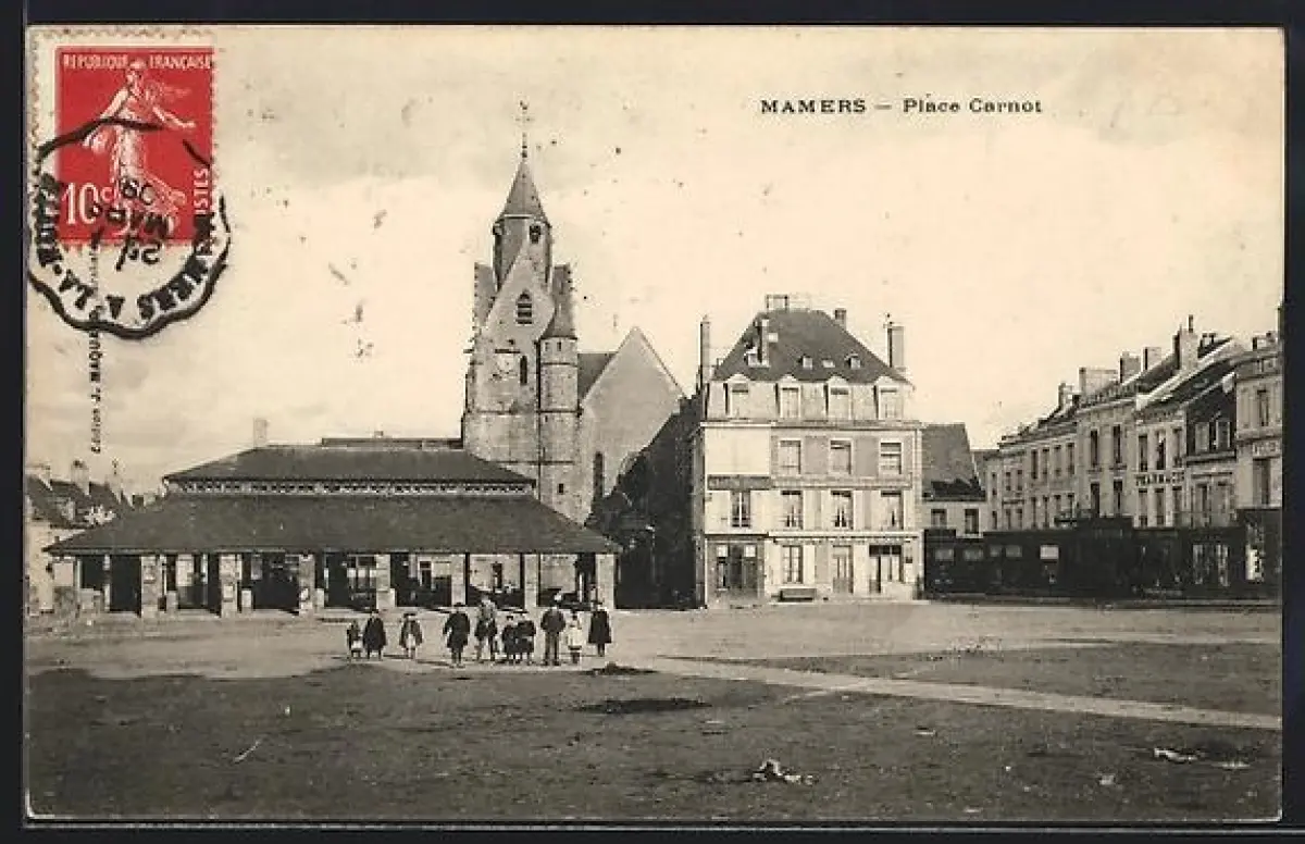 AK Mamers, Place Carnot avec église et bâtiments adjacents