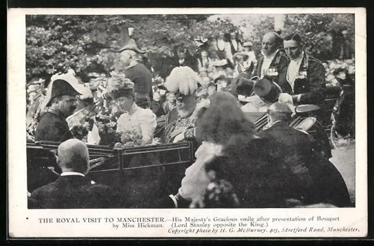 AK Manchester, the Royal Visit, his Majesty's Gracious smile after presentation of Bouquet