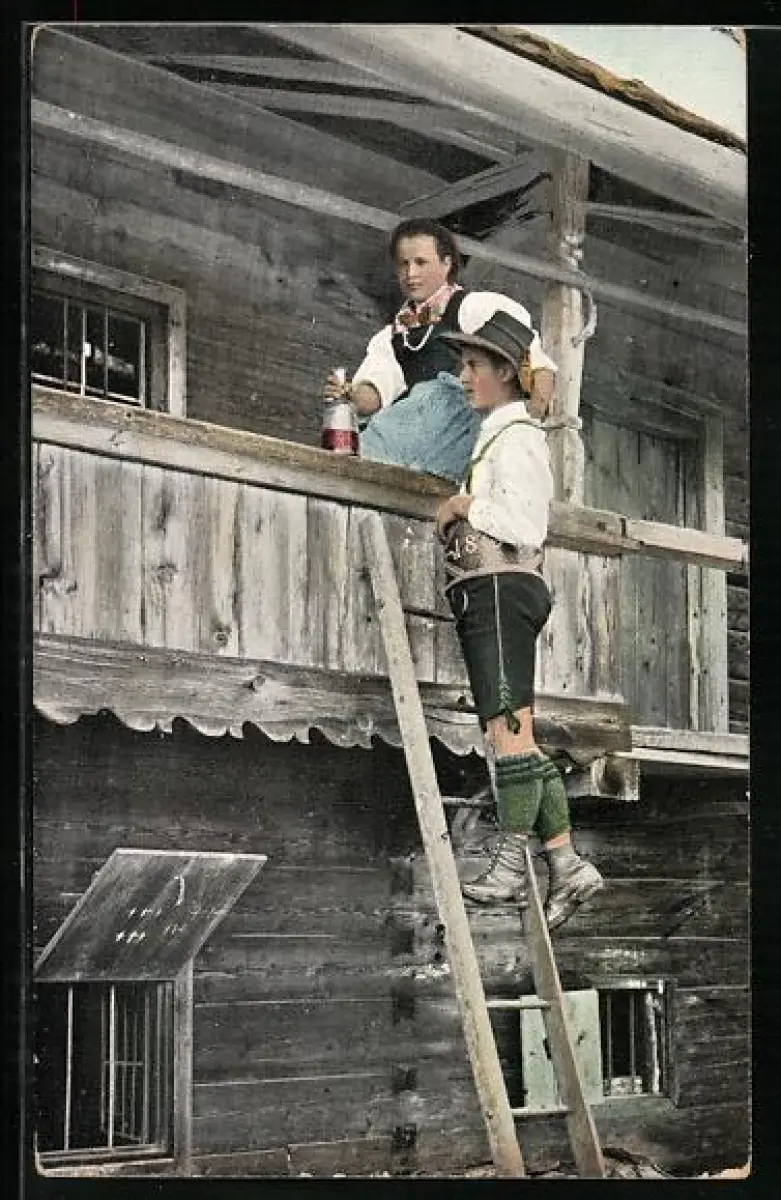 AK Mann auf Leiter bei Frau am Fenster, Erotik