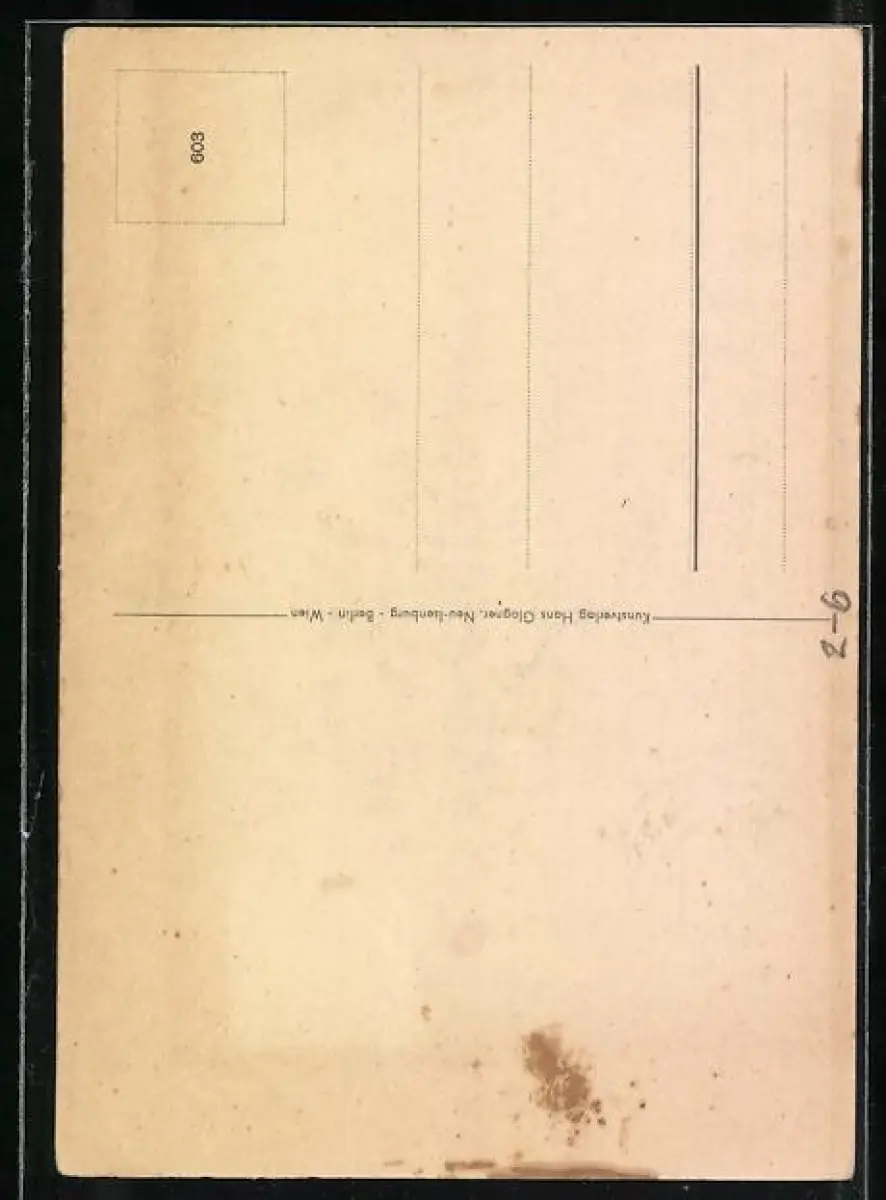 Personenbezogene Daten auf der Rückseite der Karte wurden durch blauen Textmarker unkenntlich gemacht. Die blauen Stellen sind auf die Vorderseite durchgeweicht und wirken sich negativ auf das Postkartenfoto aus
