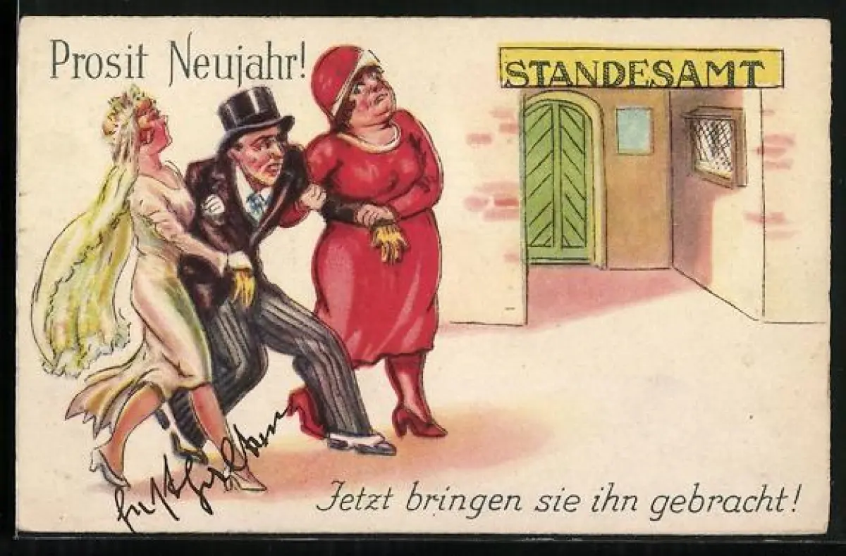 AK Mann im Anzug wird von der Braut zum Standesamt gezerrt