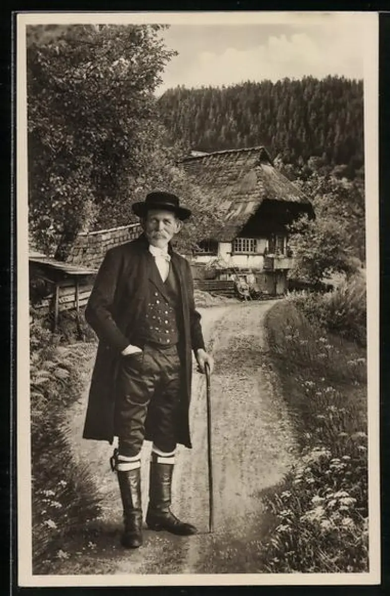 AK Mann in Schwarzwälder Tracht steht vor seinem Haus