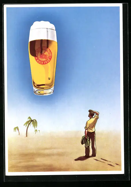 AK Mann in der Wüste erblickt ein Bierglas, Brauerei-Werbung