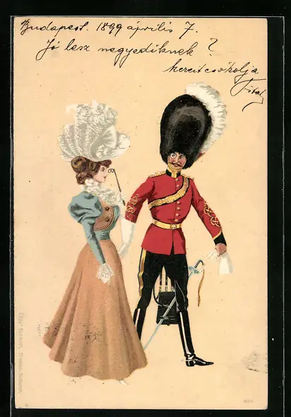 AK Mann in roter Uniformjacke und Frau im Kleid mit ausladendem Hut
