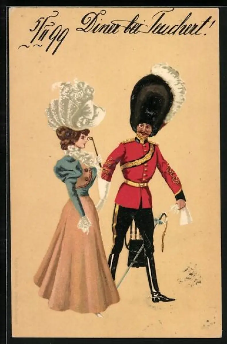 AK Mann in roter Uniformjacke und Frau im Kleid mit ausladendem Hut
