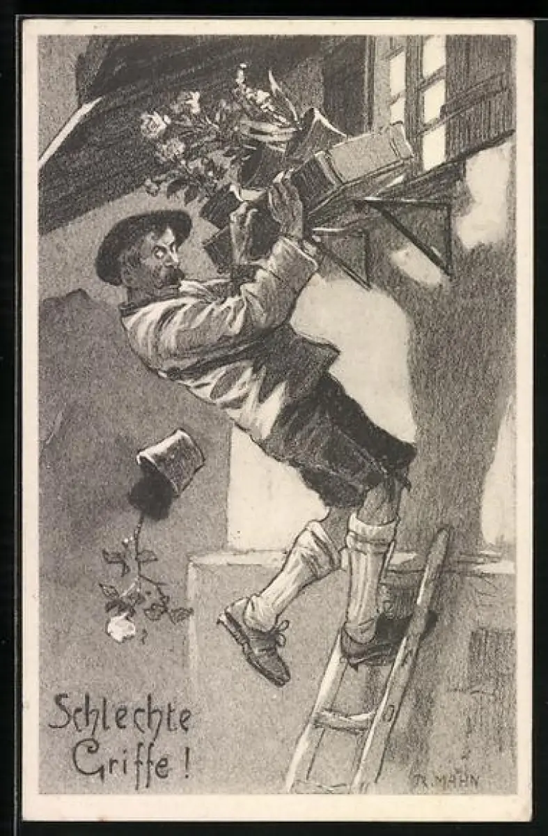 AK Mann kippt beim Fensterln von der Leiter, Erotik