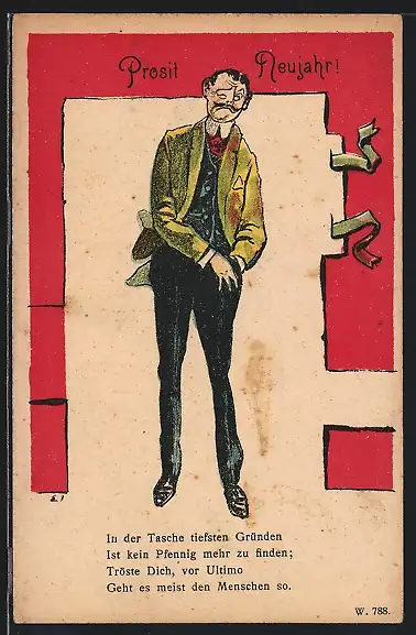 AK Mann kramt in seinen leeren Hosentaschen, Prosit Neujahr, Scherz, früher Druck