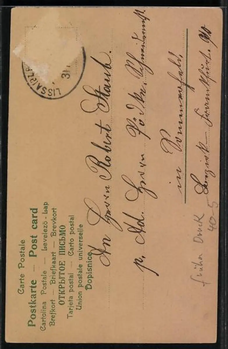 alte Ansichtskarte, gelaufen, Briefmarke entfernt, rückseitig Oberflächenschaden, guter Zustand