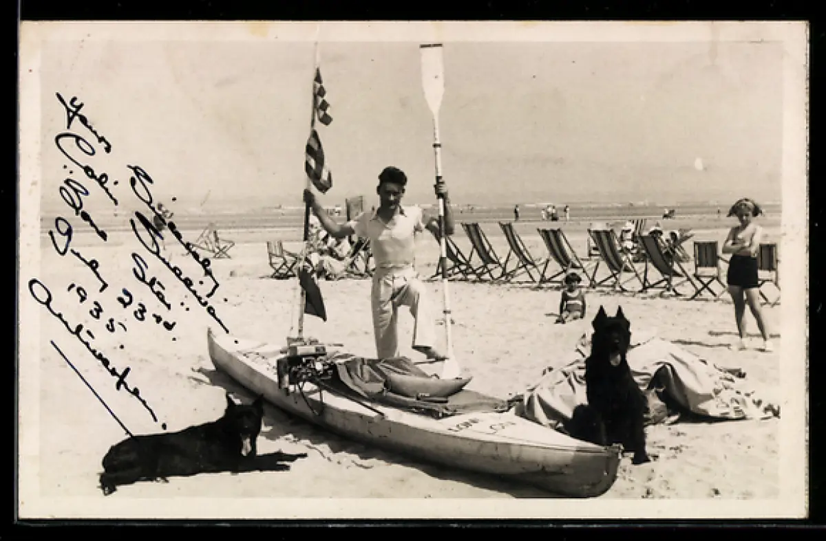 AK Mann mit einem Ruderboot am Strand