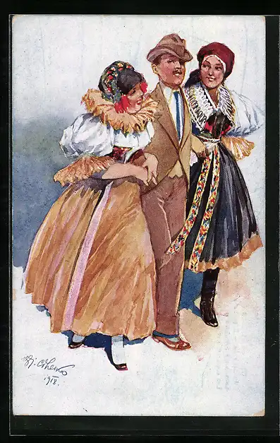 AK Mann mit zwei Frauen in tschechischer Tracht im Arm
