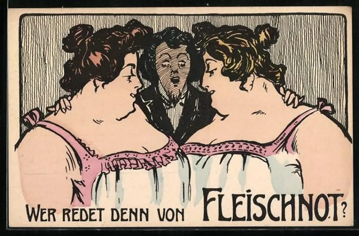 AK Mann mit zwei fülligen Damen, Wer redet denn von Fleischnot?