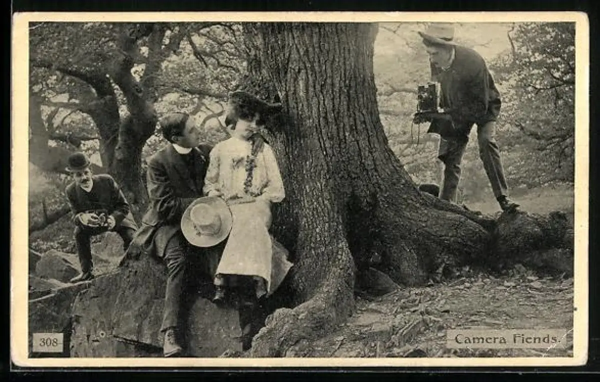 AK Mann nimmt mit einem Fotoapparat ein Paar auf