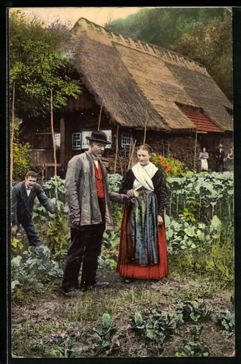 AK Mann und Frau in Schwarzwälder Tracht in einem Gemüsebeet