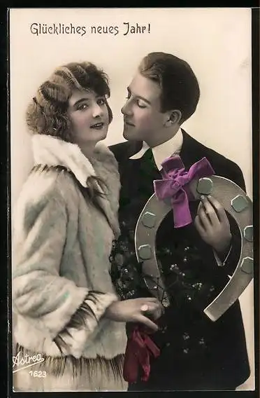 AK Mann und Frau mit grossem Hufeisen, Neujahr