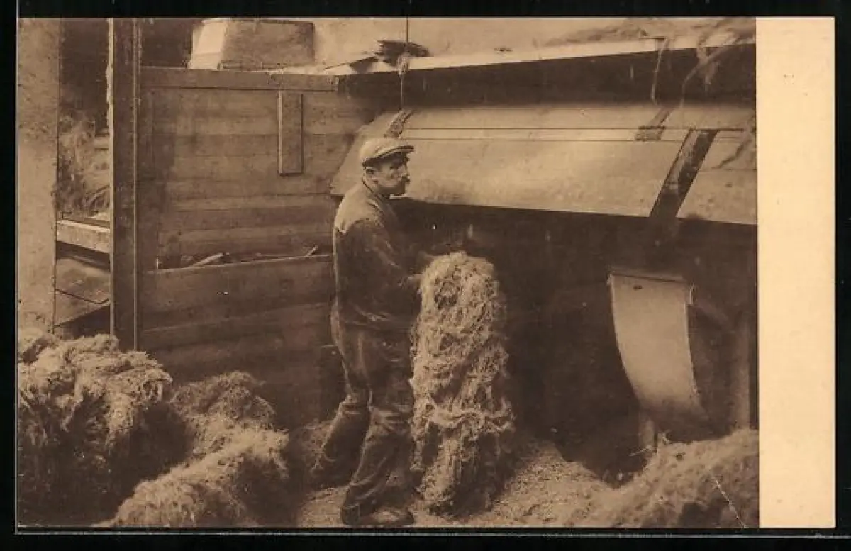 AK Mann vor einer Maschine bei der Verarbeitung von Flachs