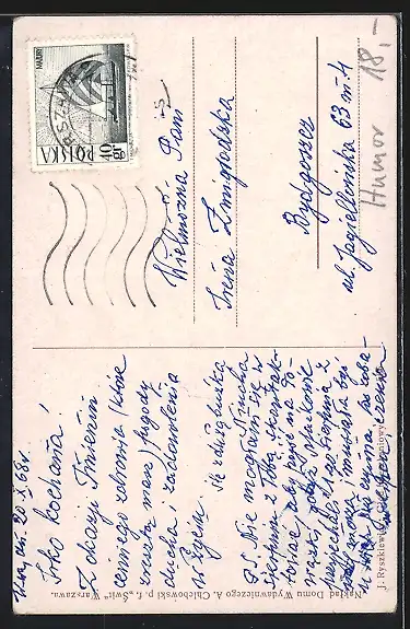 Personenbezogene Daten auf der Rückseite der Karte wurden durch blauen Textmarker unkenntlich gemacht. Die blauen Stellen sind auf die Vorderseite durchgeweicht und wirken sich negativ auf das Postkartenfoto aus