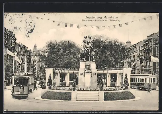 AK Mannheim, Ausstellung, Monumentalbrunnen am Kaiserring mit Strassenbahn