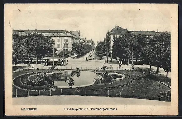 AK Mannheim, Friedrichplatz mit Heidelbergerstrasse und Strassenbahnen aus der Vogelschau