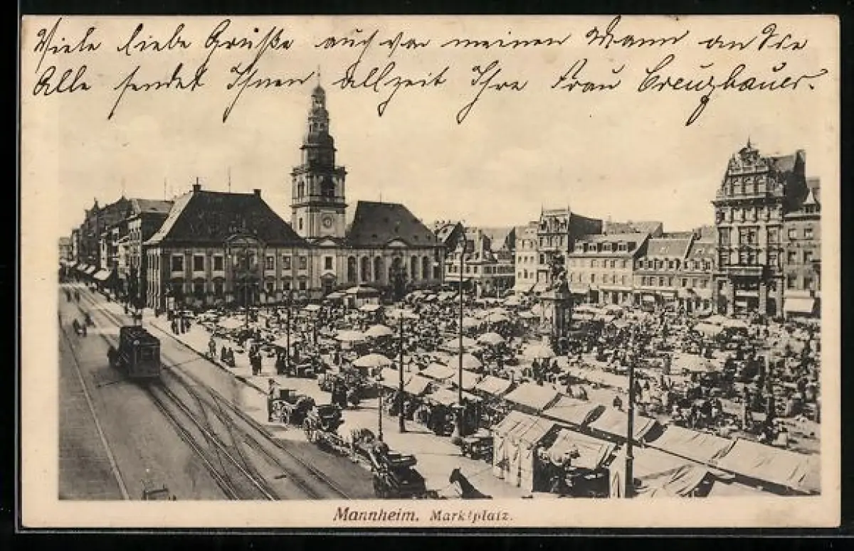 AK Mannheim, Marktplatz mit Marktbetrieb und Strassenbahn