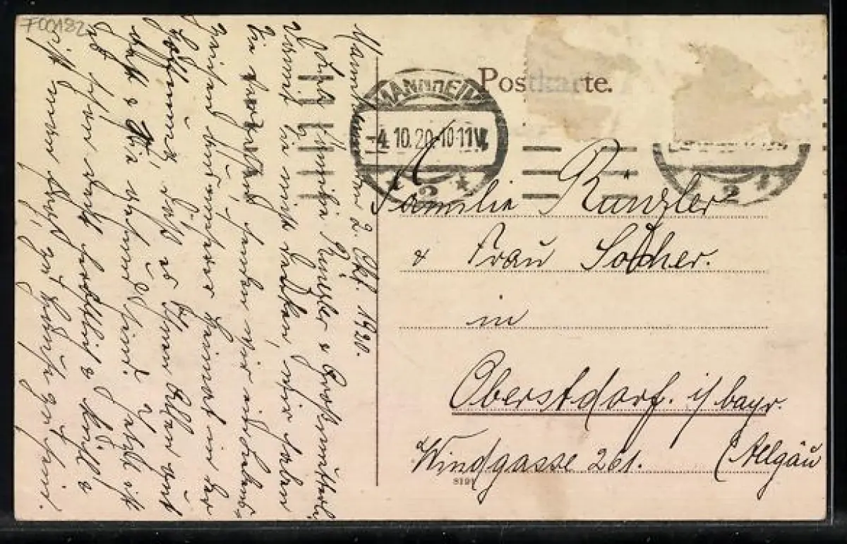 alte Ansichtskarte, gelaufen 1920, Briefmarke entfernt, rückseitig Oberflächenschaden, guter Zustand