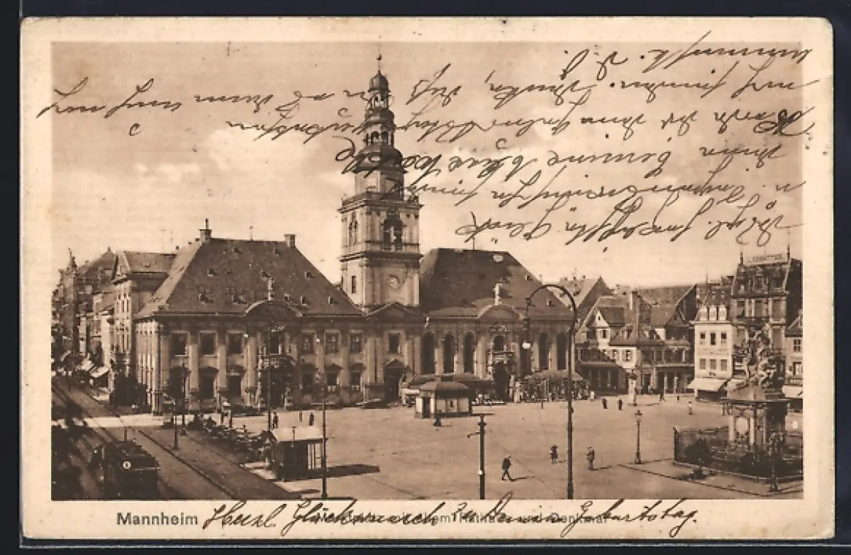 AK Mannheim, Marktplatz mit altem Rathaus und Denkmal