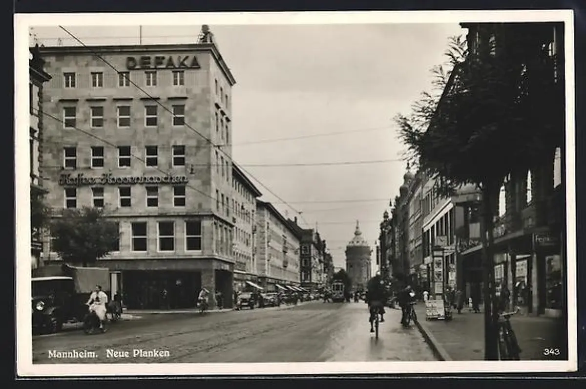 AK Mannheim, Partie an der Strasse Neue Planken, Café Kossenhaschen, Strassenbahn