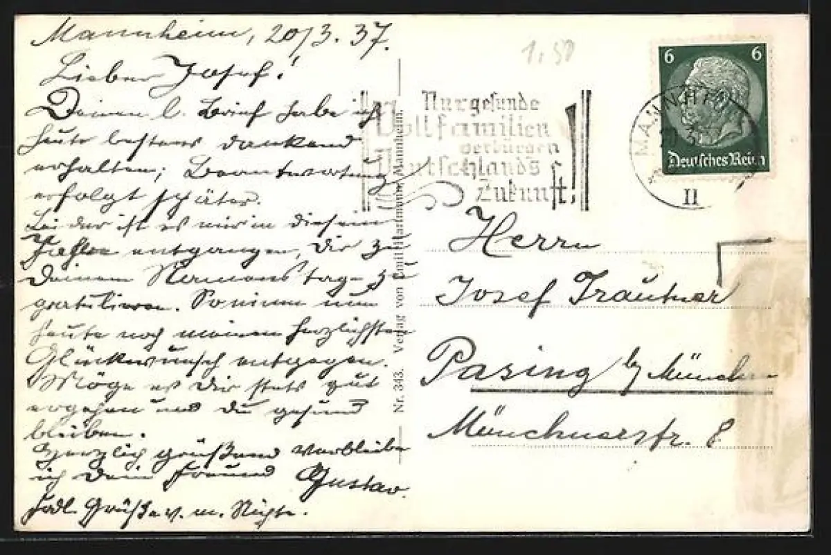 gelaufen 1937, rückseitig Klebe- und Papierreste, rückseitig Oberflächenschaden, guter Zustand