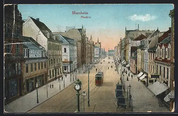 AK Mannheim, Strasse Planken mit Geschäften und Strassenbahn