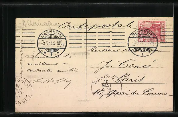 Personenbezogene Daten auf der Rückseite der Karte wurden durch blauen Textmarker unkenntlich gemacht. Die blauen Stellen sind auf die Vorderseite durchgeweicht und wirken sich negativ auf das Postkartenfoto aus