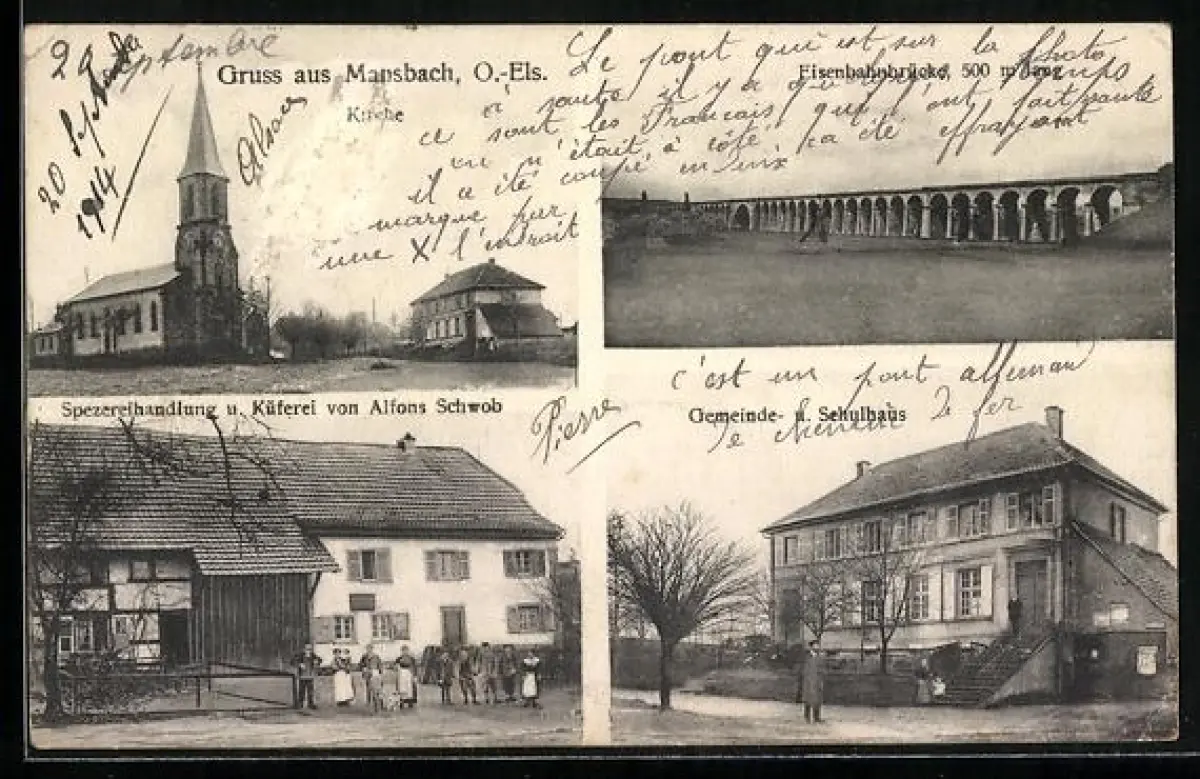 AK Mansbach /O.-Els., Spezereihandlung und Küferei von Alfons Schwob, Gemeinde- und Schulhaus, Kirche, Eisenbahnbrücke